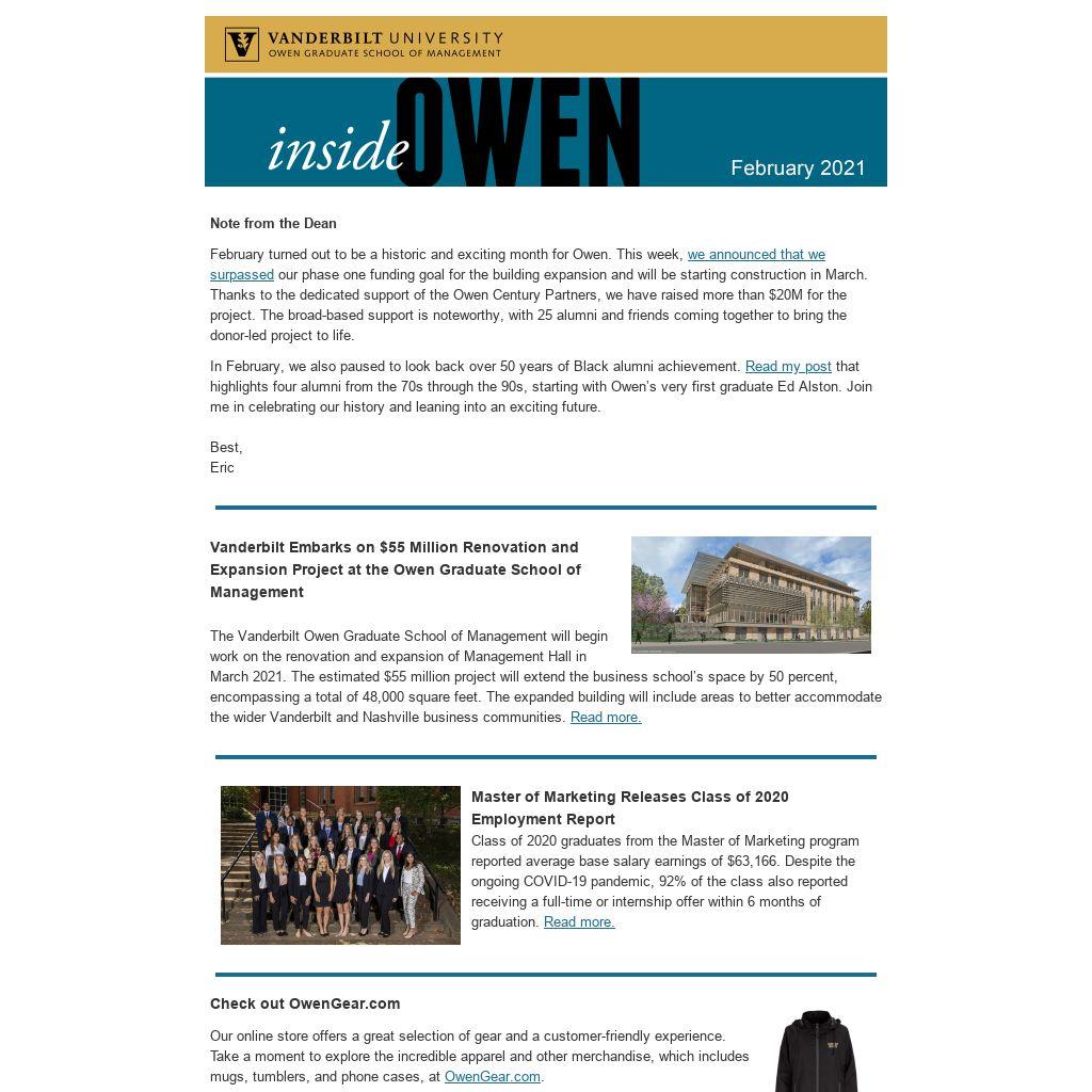 February turned out to be a historic and exciting month for Owen. This week, we announced that we surpassed our phase one funding goal for the building expansion and will be starting construction in March. Thanks to the dedicated support of the Owen Century Partners, we have raised more than $20M for the project. The broad-based support is noteworthy, with 25 alumni and friends coming together to bring the donor-led project to life.
