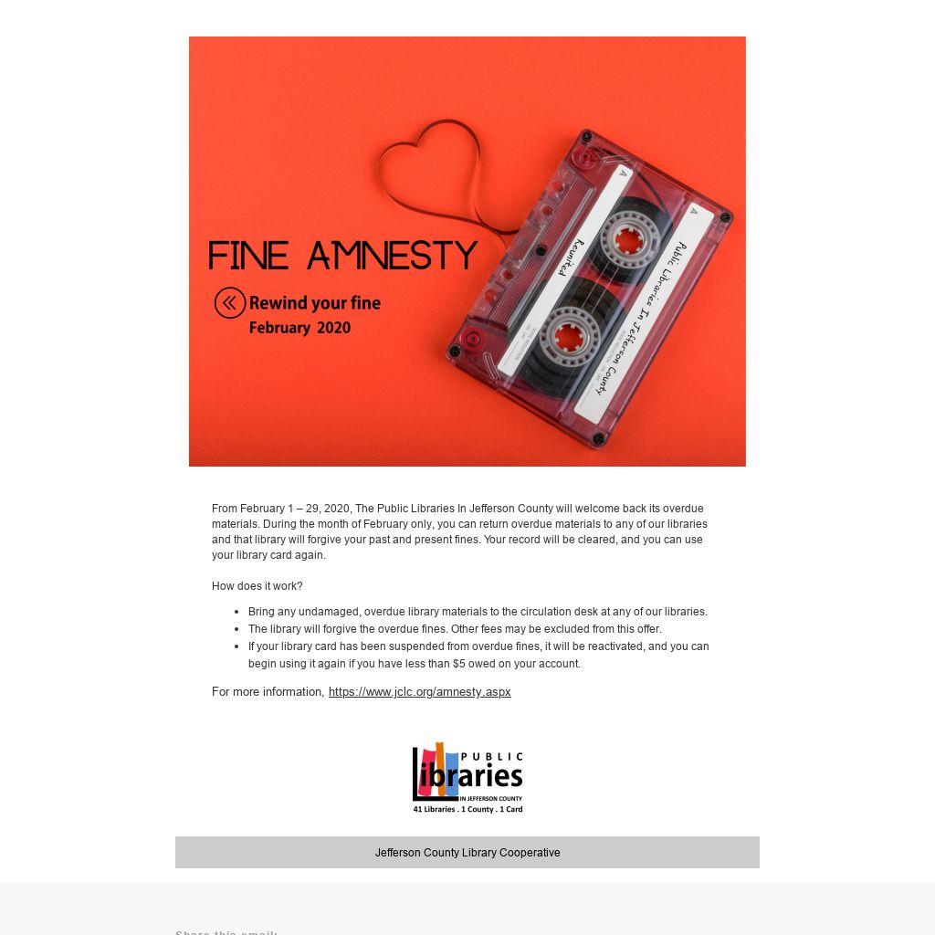From February 1 – 29, 2020, The Public Libraries In Jefferson County will welcome back its overdue materials. During the month of February only, you can return overdue materials to any of our libraries and that library will forgive your past and present fines. Your record will be cleared, and you can use your library card again.
