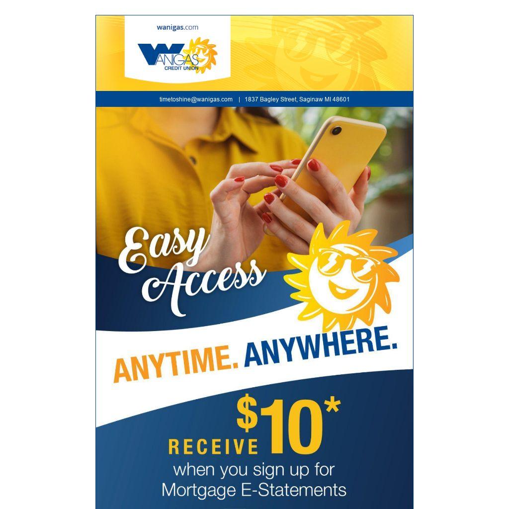 *$10 Promotion is for new Midwest Mortgage E-Statement sign-ups only now through July 31 2022. $10 will be deposited into your Wanigas savings account within 10 days of Mortgage E-Statement enrollment.