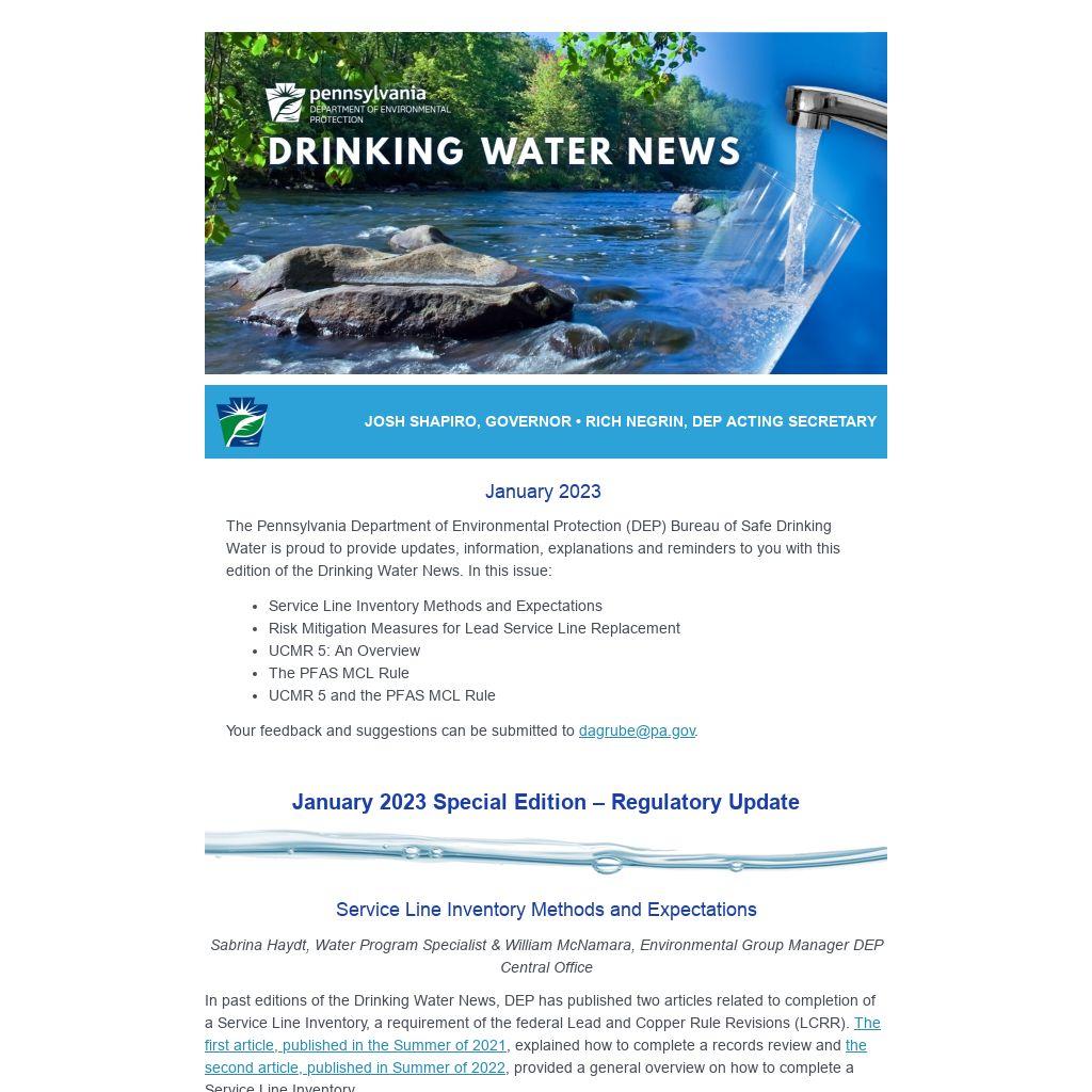 The Pennsylvania Department of Environmental Protection (DEP) Bureau of Safe Drinking Water is proud to provide updates, information, explanations and reminders to you with this edition of the Drinking Water News. In this issue: