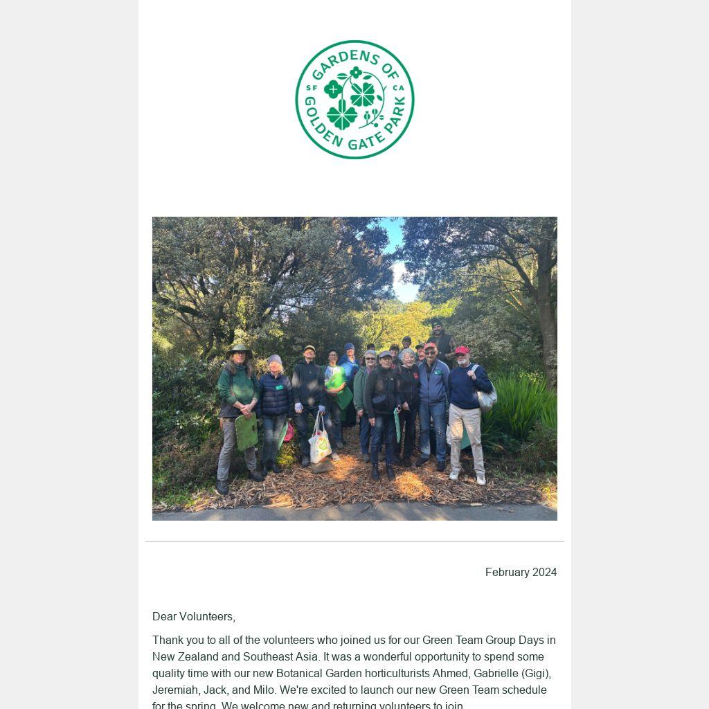 Thank you to all of the volunteers who joined us for our Green Team Group Days in New Zealand and Southeast Asia. It was a wonderful opportunity to spend some quality time with our new Botanical Garden horticulturists Ahmed, Gabrielle (Gigi), Jeremiah, Jack, and Milo. We're excited to launch our new Green Team schedule for the spring. We welcome new and returning volunteers to join.