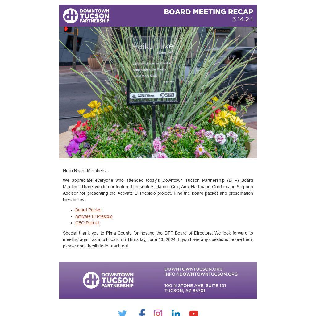 We appreciate everyone who attended today's Downtown Tucson Partnership (DTP) Board Meeting. Thank you to our featured presenters, Jannie Cox, Amy Hartmann-Gordon and Stephen Addison for presenting the Activate El Presidio project. Find the board packet and presentation links below.