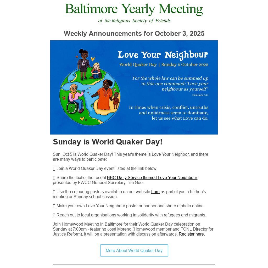 Sun, Oct 5 is World Quaker Day! This year's theme is Love Your Neighbor, and there are many ways to participate:
