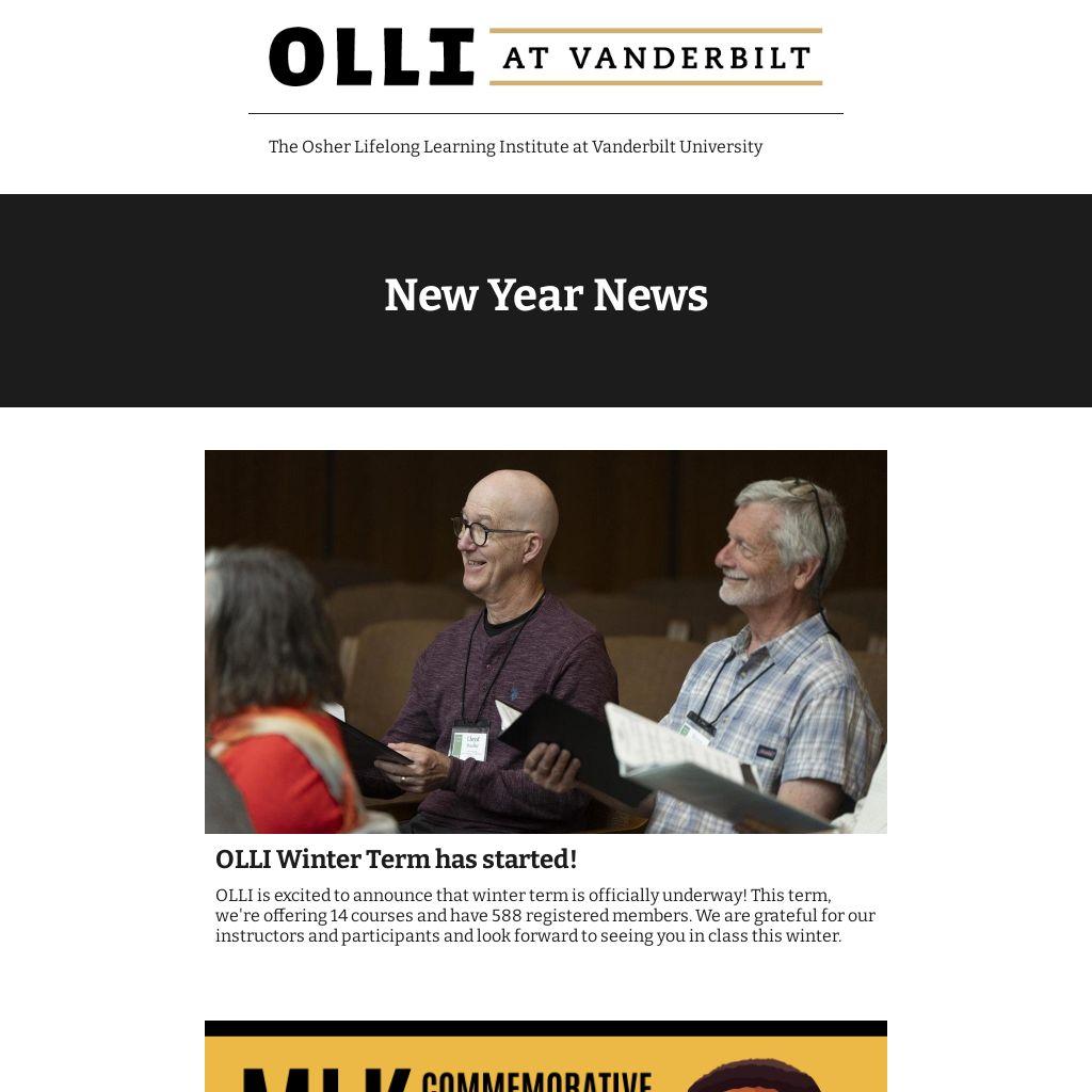 As we enter a new year, OLLI at Vanderbilt is excited about presenting more opportunities to learn and gather! We appreciate all of the feedback that we received from the recent survey. Thank you for participating.