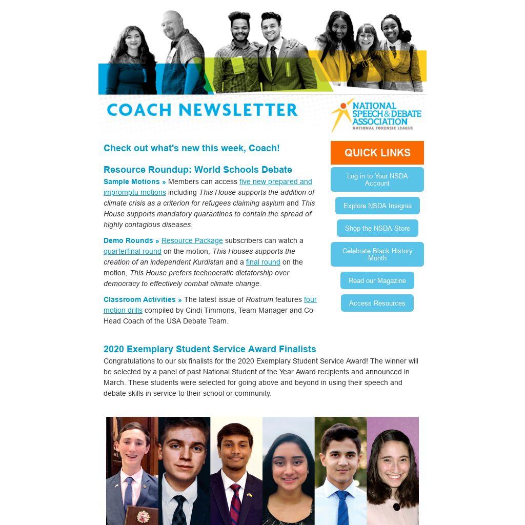 Congratulations to our six finalists for the 2020 Exemplary Student Service Award! The winner will be selected by a panel of past National Student of the Year Award recipients and announced in March. These students were selected for going above and beyond in using their speech and debate skills in service to their school or community.