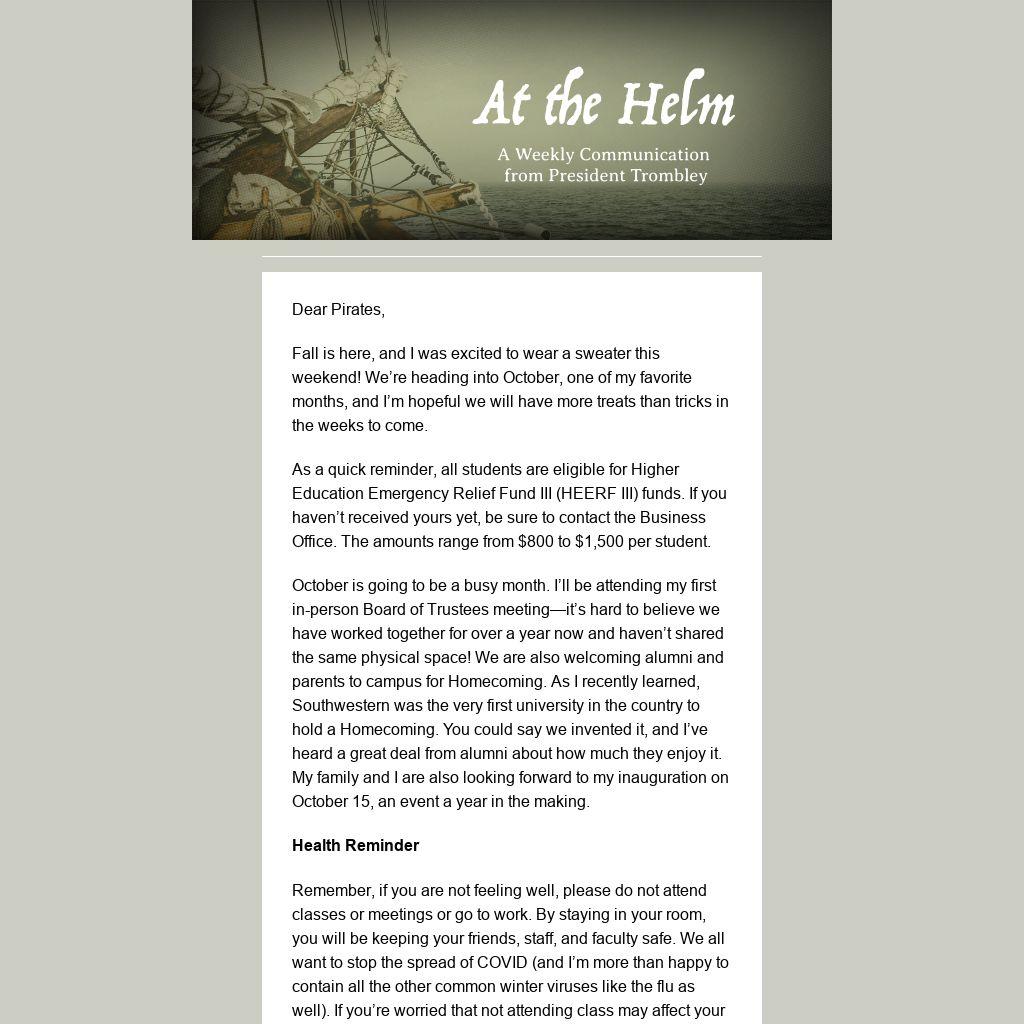 Remember, if you are not feeling well, please do not attend classes or meetings or go to work. By staying in your room, you will be keeping your friends, staff, and faculty safe. We all want to stop the spread of COVID (and I’m more than happy to contain all the other common winter viruses like the flu as well). If you’re worried that not attending class may affect your grade, please reach out to your professor.