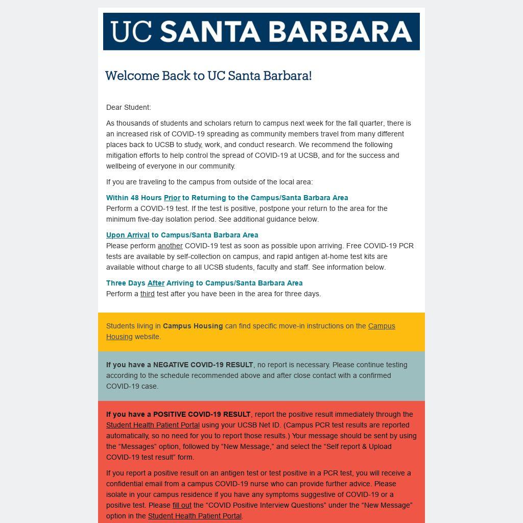Please perform another COVID-19 test as soon as possible upon arriving. Free COVID-19 PCR tests are available by self-collection on campus, and rapid antigen at-home test kits are available without charge to all UCSB students, faculty and staff. See information below.