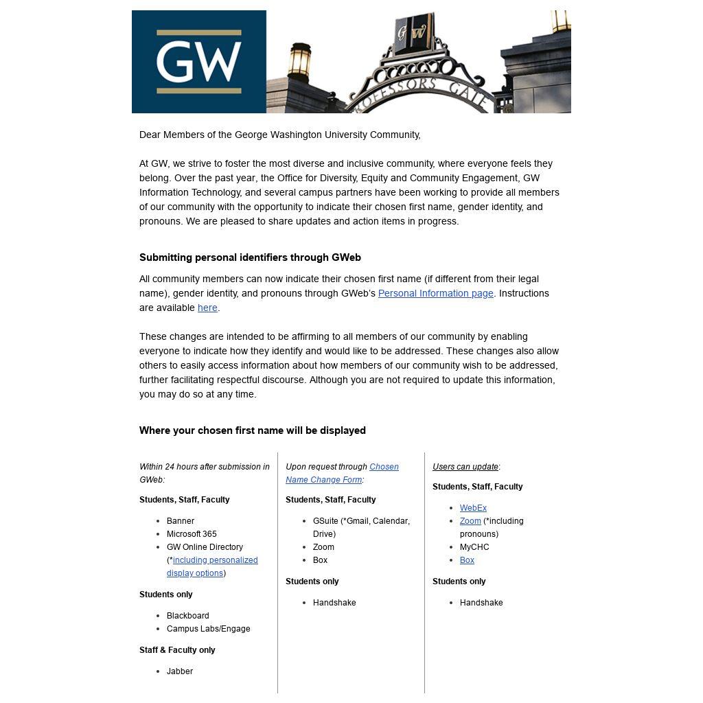 At GW, we strive to foster the most diverse and inclusive community, where everyone feels they belong. Over the past year, the Office for Diversity, Equity and Community Engagement, GW Information Technology, and several campus partners have been working to provide all members of our community with the opportunity to indicate their chosen first name, gender identity, and pronouns. We are pleased to share updates and action items in progress.