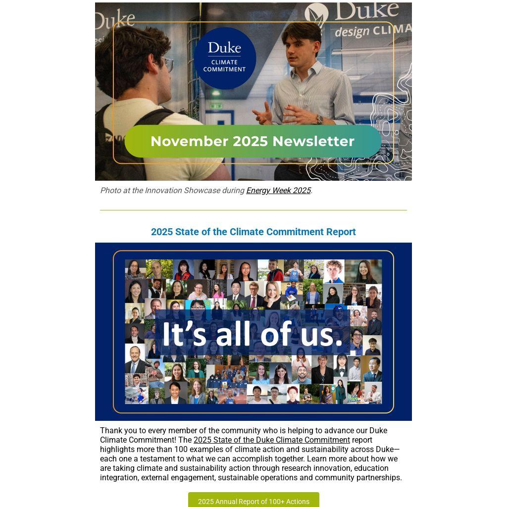 Thank you to every member of the community who is helping to advance our Duke Climate Commitment! The 2025 State of the Duke Climate Commitment report highlights more than 100 examples of climate action and sustainability across Duke—each one a testament to what we can accomplish together. Learn more about how we are taking climate and sustainability action through research innovation, education integration, external engagement, sustainable operations and community partnerships.