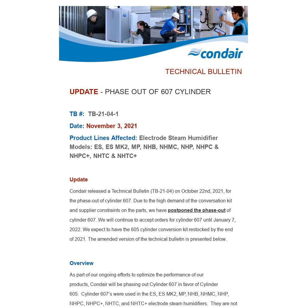As part of our ongoing efforts to optimize the performance of our products, Condair will be phasing out Cylinder 607 in favor of Cylinder 605. Cylinder 607’s were used in the ES, ES MK2, MP, NHB, NHMC, NHP, NHPC, NHPC+, NHTC, and NHTC+ electrode steam humidifiers. They are not used in NH-EL or the EL Series electrode steam humidifiers.