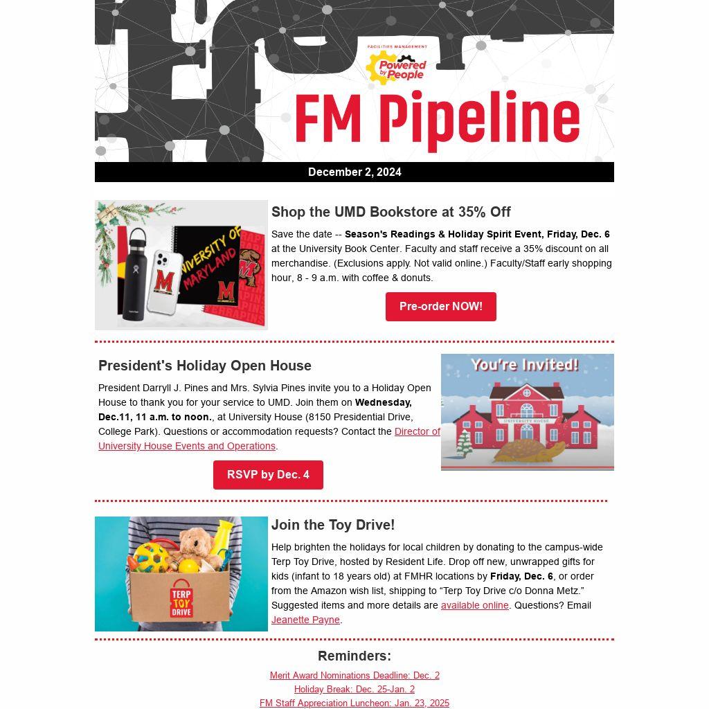 President Darryll J. Pines and Mrs. Sylvia Pines invite you to a Holiday Open House to thank you for your service to UMD. Join them on Wednesday, Dec.11, 11 a.m. to noon., at University House (8150 Presidential Drive, College Park). Questions or accommodation requests? Contact the Director of University House Events and Operations.