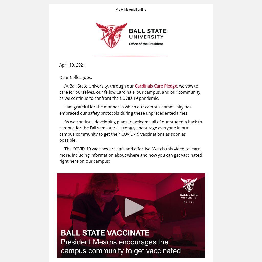 At Ball State University, through our Cardinals Care Pledge, we vow to care for ourselves, our fellow Cardinals, our campus, and our community as we continue to confront the COVID-19 pandemic.