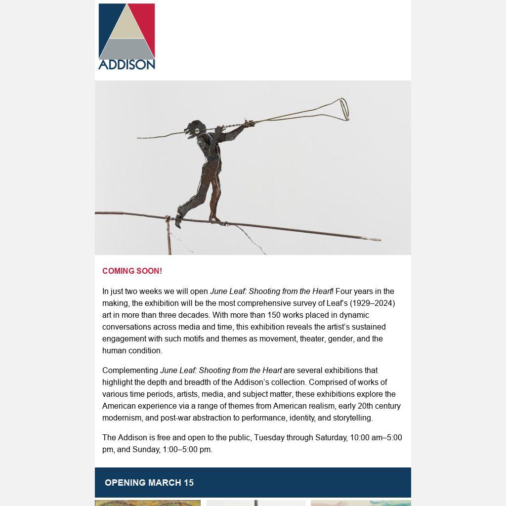 The Addison is free and open to the public, Tuesday through Saturday, 10:00 am–5:00 pm, and Sunday, 1:00–5:00 pm.