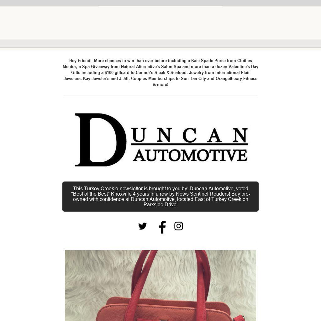 Hey Friend! More chances to win than ever before including a Kate Spade Purse from Clothes Mentor, a Spa Giveaway from Natural Alternative's Salon Spa and more than a dozen Valentine's Day Gifts including a $100 giftcard to Connor's Steak & Seafood, Jewelry from International Flair Jewelers, Kay Jeweler's and J.Jill, Couples Memberships to Sun Tan City and Orangetheory Fitness & more!