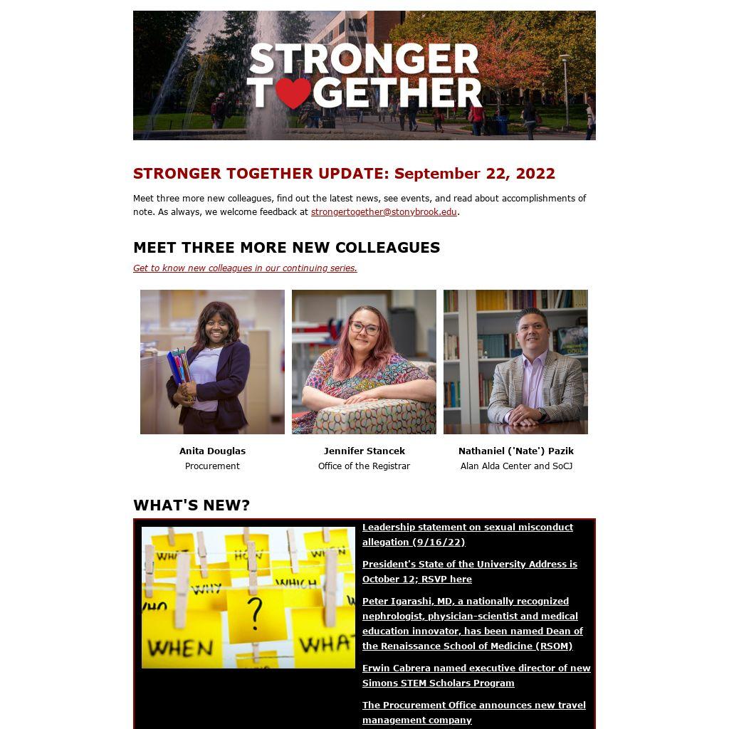 Meet three more new colleagues, find out the latest news, see events, and read about accomplishments of note. As always, we welcome feedback at strongertogether@stonybrook.edu.