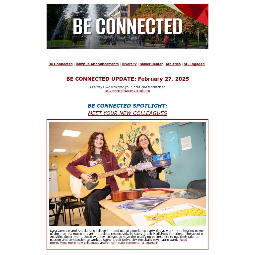 Kara Gerstein and Angela Reis believe in â and get to experience every day at work â the healing power of the arts. As music and art therapists, respectively, in Stony Brook Medicineâs Functional Therapeutic Activities department, these two new colleagues have the gratifying opportunity to put their talents, passion and compassion to work at Stony Brook University Hospitalâs psychiatric ward. Read more. Meet more new colleagues and/or nominate someone, or yourself!