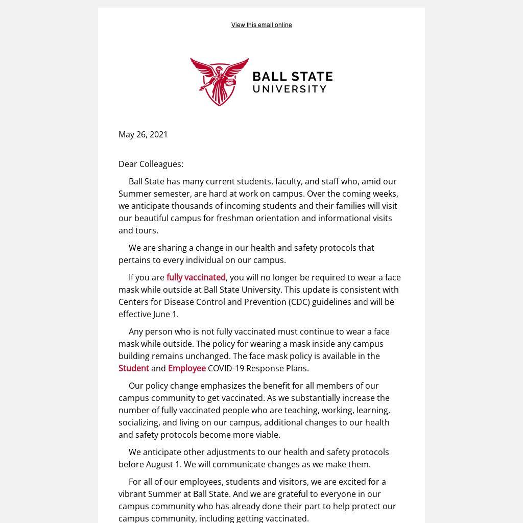 For all of our employees, students and visitors, we are excited for a vibrant Summer at Ball State. And we are grateful to everyone in our campus community who has already done their part to help protect our campus community, including getting vaccinated.