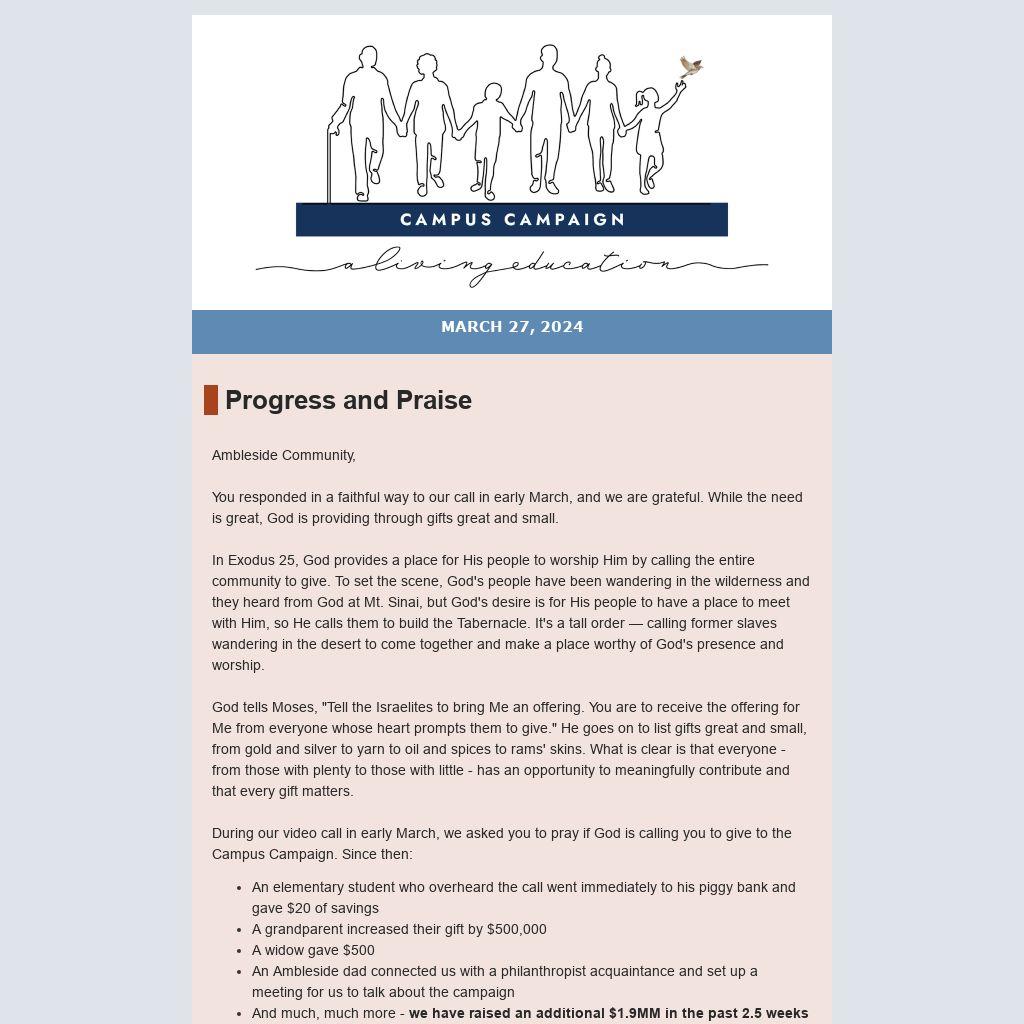 During our video call in early March, we asked you to pray if God is calling you to give to the Campus Campaign. Since then: