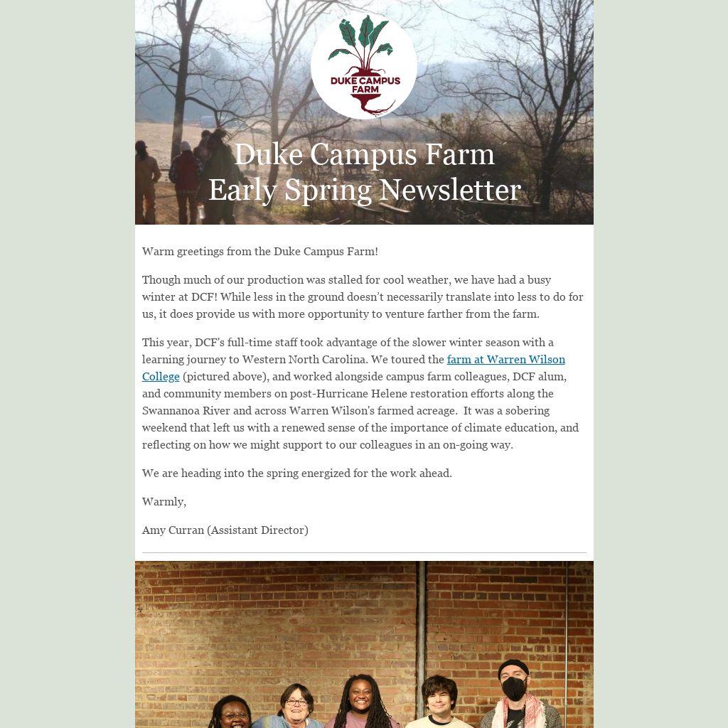 This year, DCF's full-time staff took advantage of the slower winter season with a learning journey to Western North Carolina. We toured the farm at Warren Wilson College (pictured above), and worked alongside campus farm colleagues, DCF alum, and community members on post-Hurricane Helene restoration efforts along the Swannanoa River and across Warren Wilson's farmed acreage. It was a sobering weekend that left us with a renewed sense of the importance of climate education, and reflecting on how we might support to our colleagues in an on-going way.
