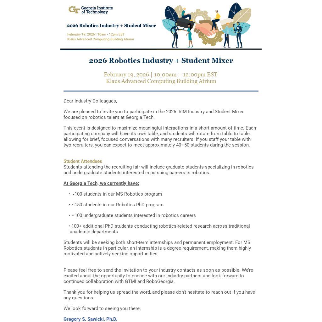 We are pleased to invite you to participate in the 2026 IRIM Industry and Student Mixer focused on robotics talent at Georgia Tech.