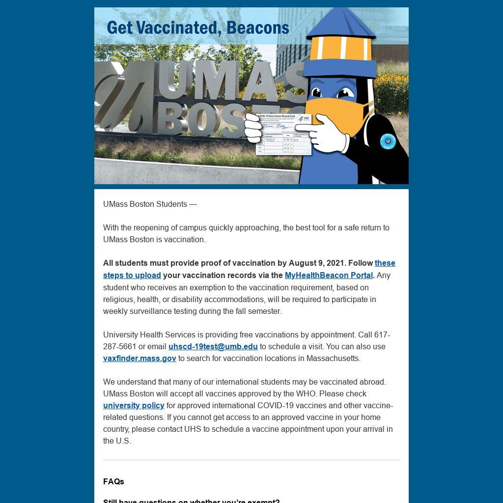 - The vaccine is required for all students who plan to live, learn, or work on campus. Students may request an exemption from the vaccination requirement, subject to religious, health, and disability accommodations provided for by state and federal law. Students with questions should call 617-287-5660 and/or contact UHS via email at UHS@UMB.edu.