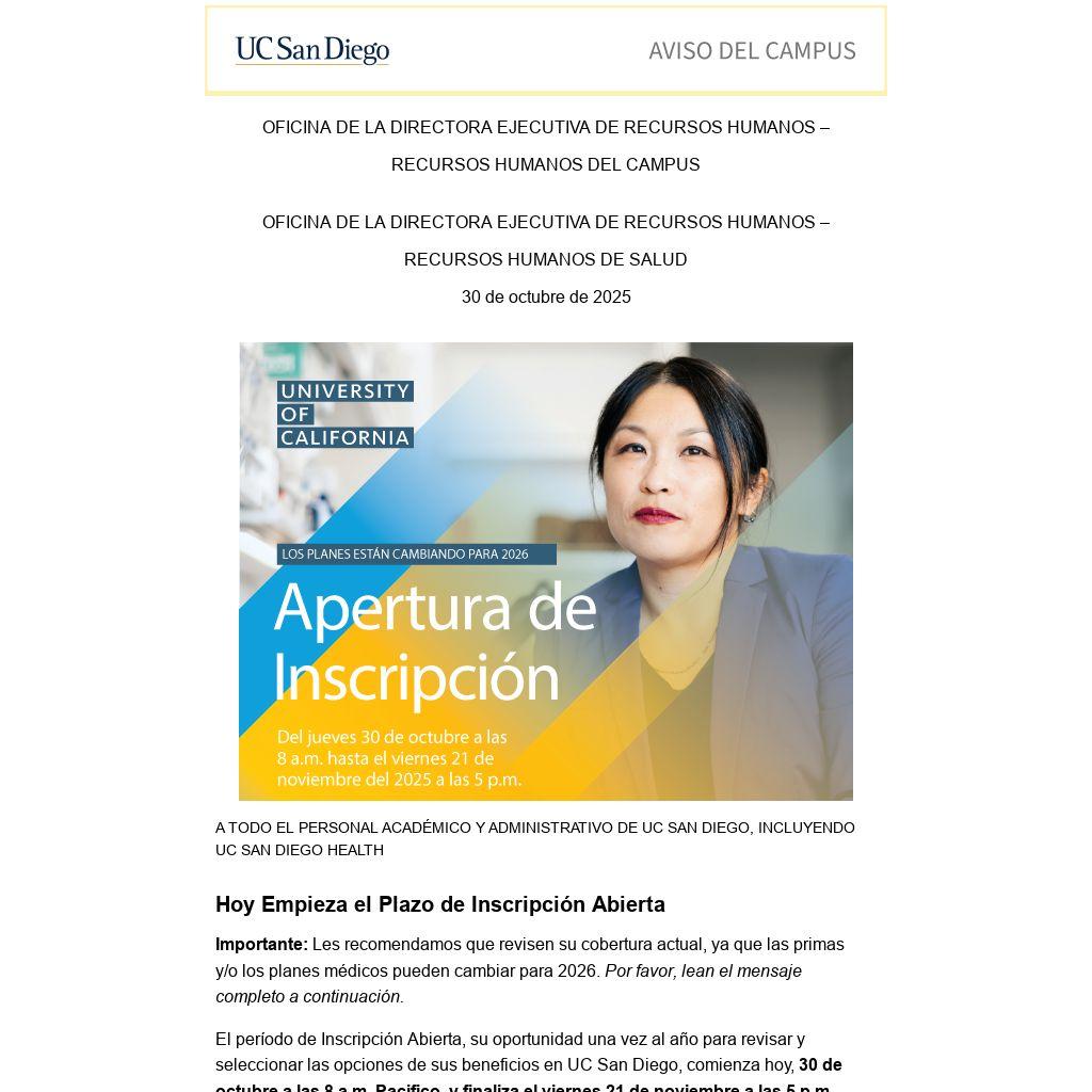 Una vez que hayan definido qué opciones de beneficios son las más adecuadas para ustedes y sus familias, ingresen al portal UCPath para actualizar su inscripción para 2026. Los invitamos a visitar el sitio web de UC Open Enrollment para obtener más información.