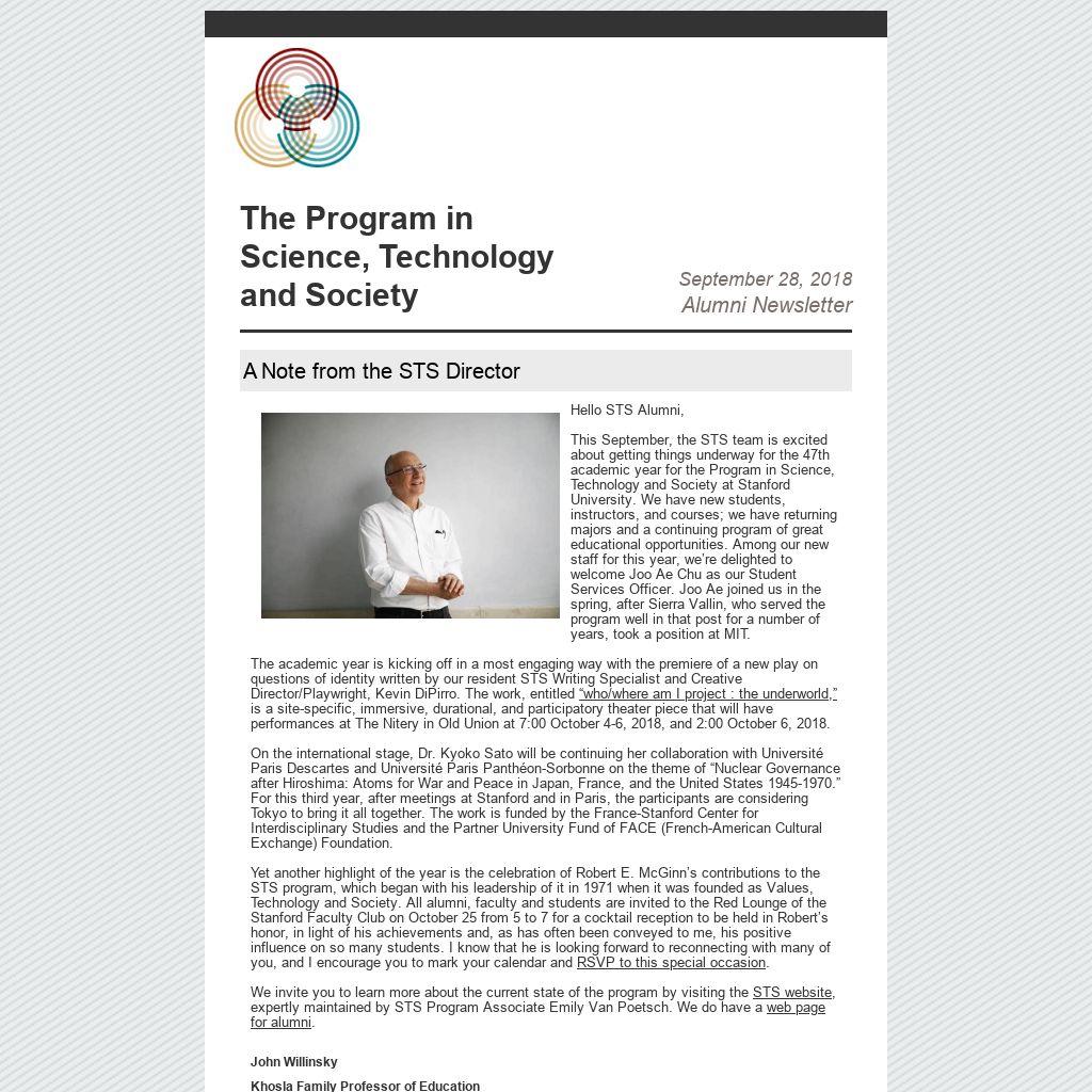 We invite you to learn more about the current state of the program by visiting the STS website, expertly maintained by STS Program Associate Emily Van Poetsch. We do have a web page for alumni.
