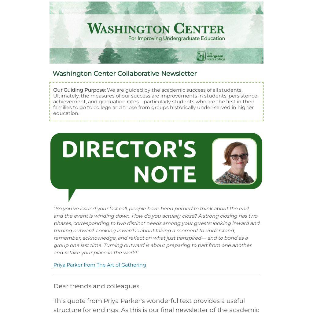 AND we will be turning our attention to convening stakeholders and engaging in generative conversations to help inform a strategic plan that attends to the new conditions for our campus partners. If you have thoughts or advice for us as we develop future directions for the Washington Center, please share them in this simple form.