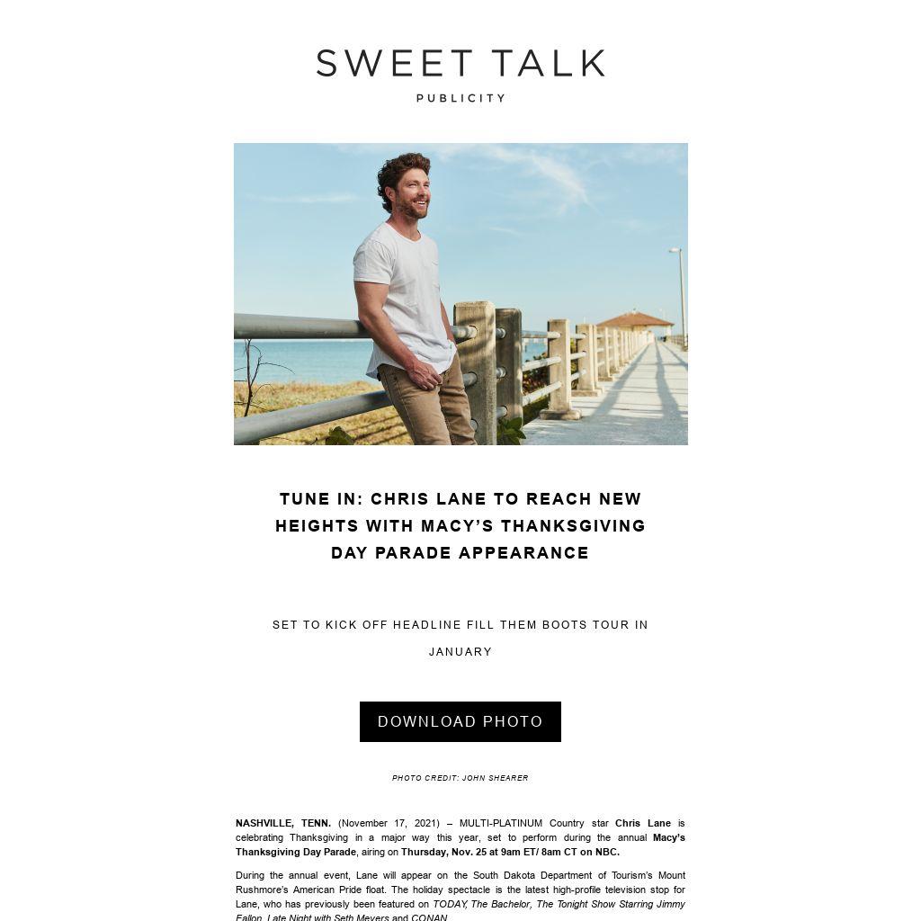NASHVILLE, TENN. (November 17, 2021) – MULTI-PLATINUM Country star Chris Lane is celebrating Thanksgiving in a major way this year, set to perform during the annual Macy’s Thanksgiving Day Parade, airing on Thursday, Nov. 25 at 9am ET/ 8am CT on NBC.