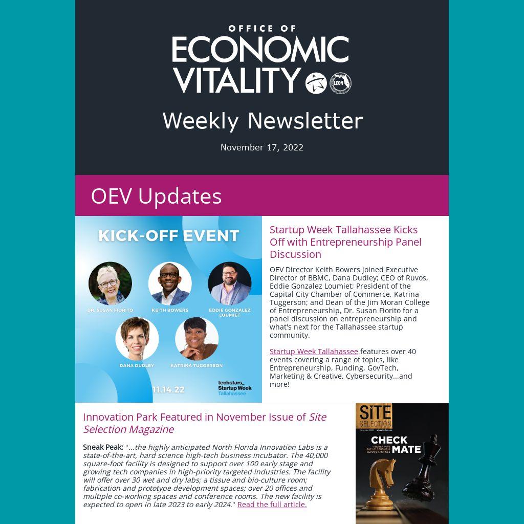 OEV Director Keith Bowers joined Executive Director of BBMC, Dana Dudley; CEO of Ruvos, Eddie Gonzalez Loumiet; President of the Capital City Chamber of Commerce, Katrina Tuggerson; and Dean of the Jim Moran College of Entrepreneurship, Dr. Susan Fiorito for a panel discussion on entrepreneurship and what's next for the Tallahassee startup community.