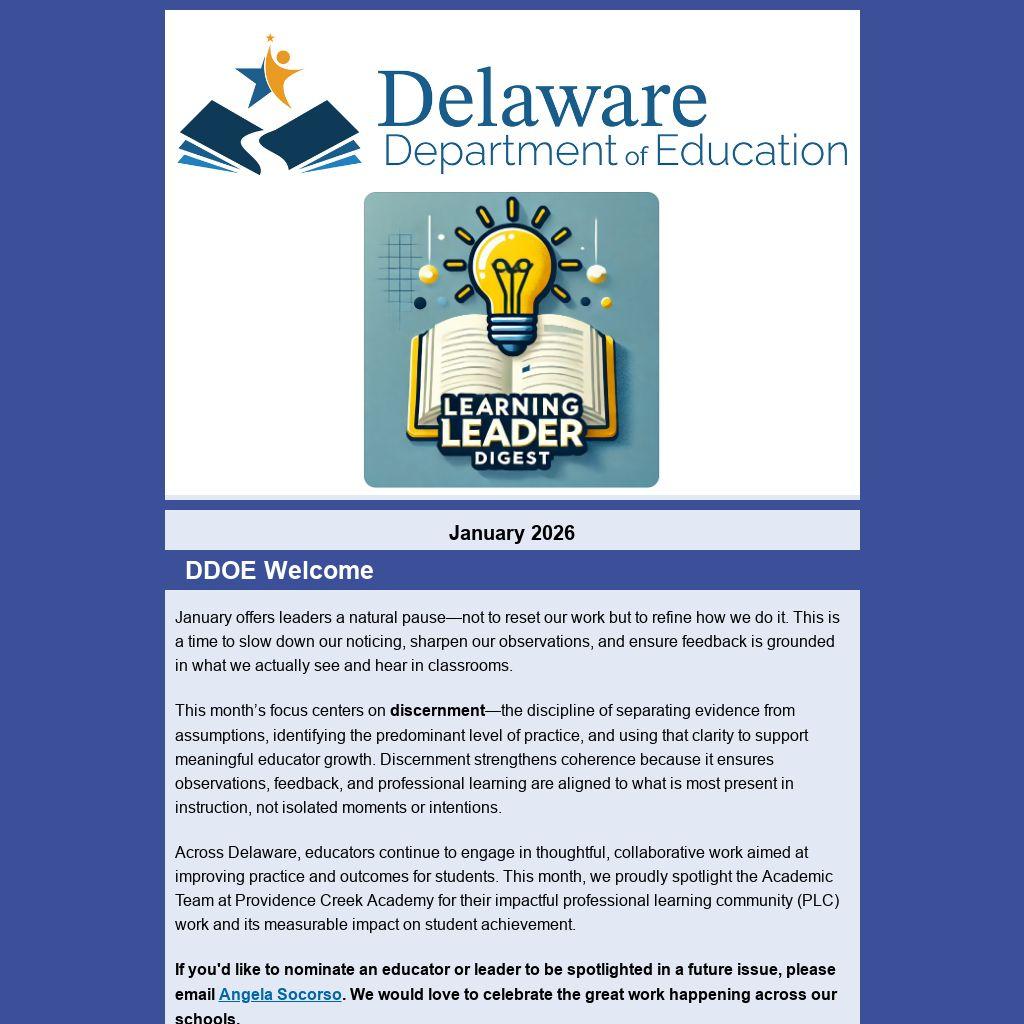 School principals are invited to a two-hour, virtual session on Performance Area 3 - Rigorous Assignments (3.1) to be held 9-11:00 a.m. Tuesday, Jan. 20. Held in partnership with Research for Better Teaching (RBT), the session will focus on identifying evidence of rigorous assignments and crafting high-quality action steps aligned to DTGSS 3.1. Principals will gain practical tools for observations, calibration, and feedback, and will earn two hours toward DTGSS re-credentialing. Register for PDMS course #44134. For more information, access the PA 3.1 flyer. (DDOE contact: Angela Socorso)