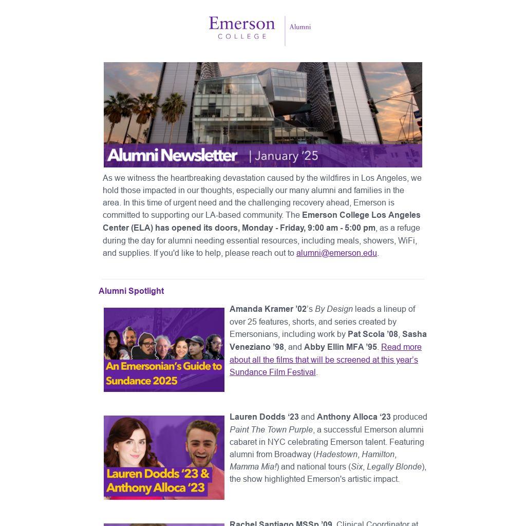 As we witness the heartbreaking devastation caused by the wildfires in Los Angeles, we hold those impacted in our thoughts, especially our many alumni and families in the area. In this time of urgent need and the challenging recovery ahead, Emerson is committed to supporting our LA-based community. The Emerson College Los Angeles Center (ELA) has opened its doors, Monday - Friday, 9:00 am - 5:00 pm, as a refuge during the day for alumni needing essential resources, including meals, showers, WiFi, and supplies. If you'd like to help, please reach out to alumni@emerson.edu.
