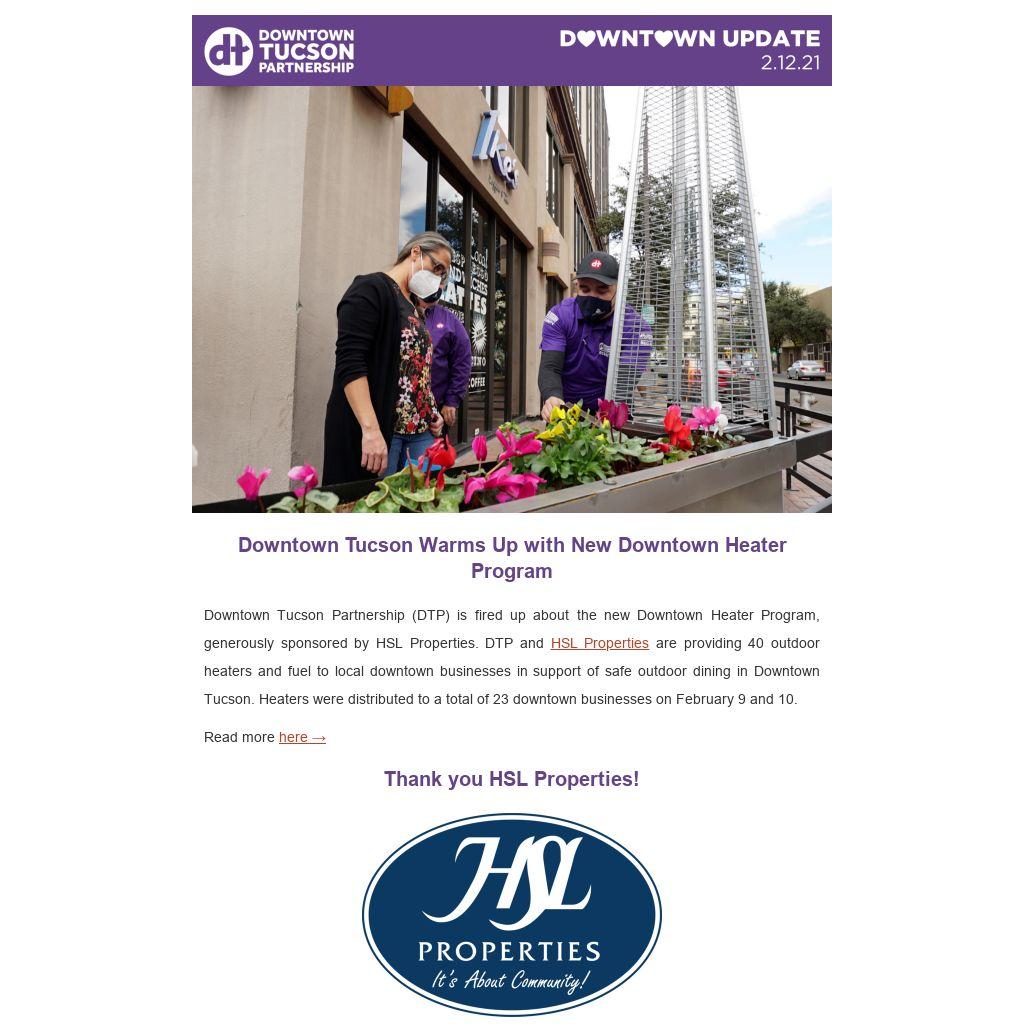 Downtown Tucson Partnership (DTP) is fired up about the new Downtown Heater Program, generously sponsored by HSL Properties. DTP and HSL Properties are providing 40 outdoor heaters and fuel to local downtown businesses in support of safe outdoor dining in Downtown Tucson. Heaters were distributed to a total of 23 downtown businesses on February 9 and 10.
