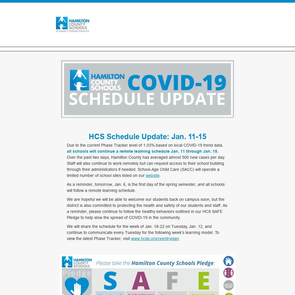Due to the current Phase Tracker level of 1.03% based on local COVID-19 trend data, all schools will continue a remote learning schedule Jan. 11 through Jan. 15. Over the past two days, Hamilton County has averaged almost 500 new cases per day. Staff will also continue to work remotely but can request access to their school building through their administrators if needed. School-Age Child Care (SACC) will operate a limited number of school sites listed on our website.
