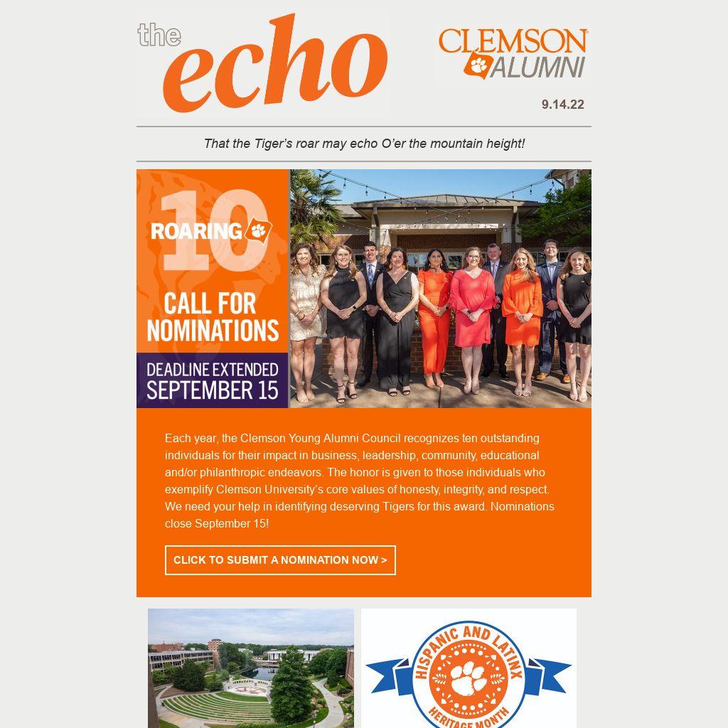 Each year, the Clemson Young Alumni Council recognizes ten outstanding individuals for their impact in business, leadership, community, educational and/or philanthropic endeavors. The honor is given to those individuals who exemplify Clemson University’s core values of honesty, integrity, and respect. We need your help in identifying deserving Tigers for this award. Nominations close September 15!