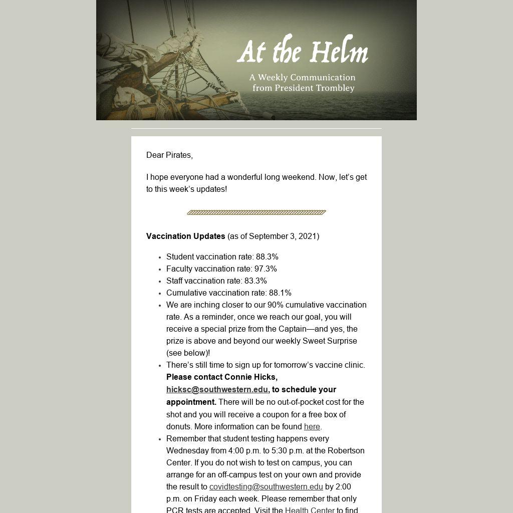 Remember that student testing happens every Wednesday from 4:00 p.m. to 5:30 p.m. at the Robertson Center. If you do not wish to test on campus, you can arrange for an off-campus test on your own and provide the result to covidtesting@southwestern.edu by 2:00 p.m. on Friday each week. Please remember that only PCR tests are accepted. Visit the Health Center to find off-campus testing locations.