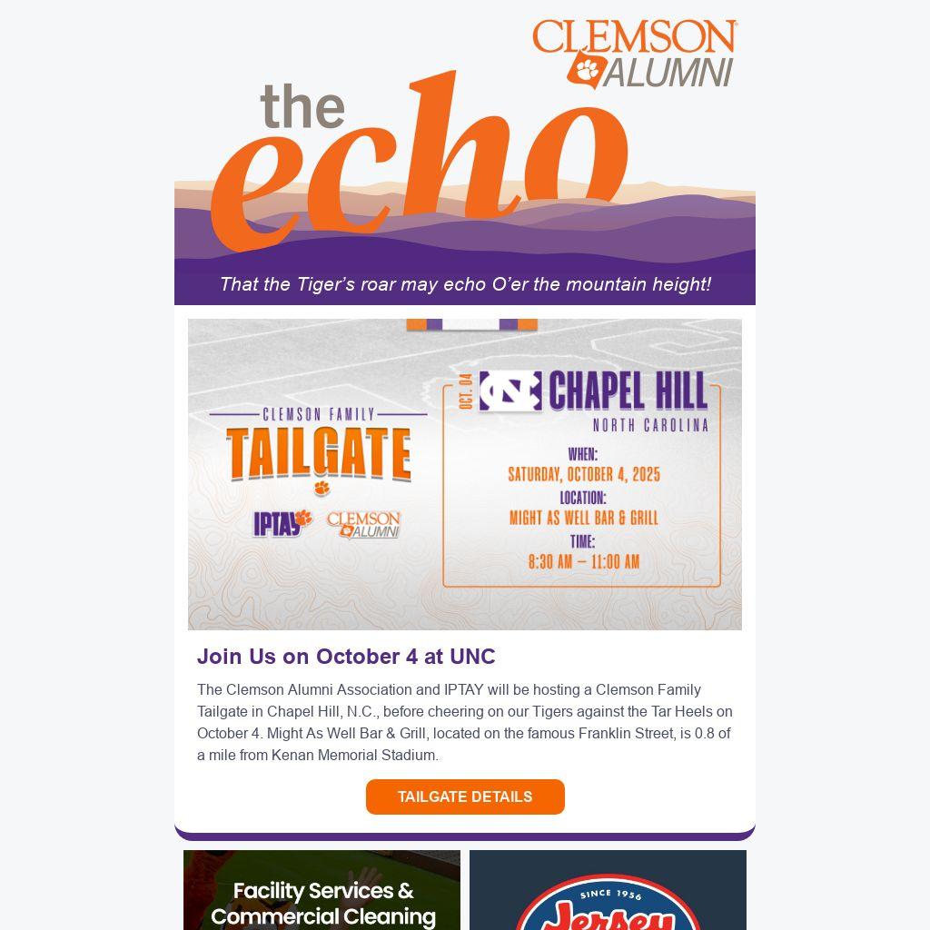 The Clemson Alumni Association and IPTAY will be hosting a Clemson Family Tailgate in Chapel Hill, N.C., before cheering on our Tigers against the Tar Heels on October 4. Might As Well Bar & Grill, located on the famous Franklin Street, is 0.8 of a mile from Kenan Memorial Stadium.