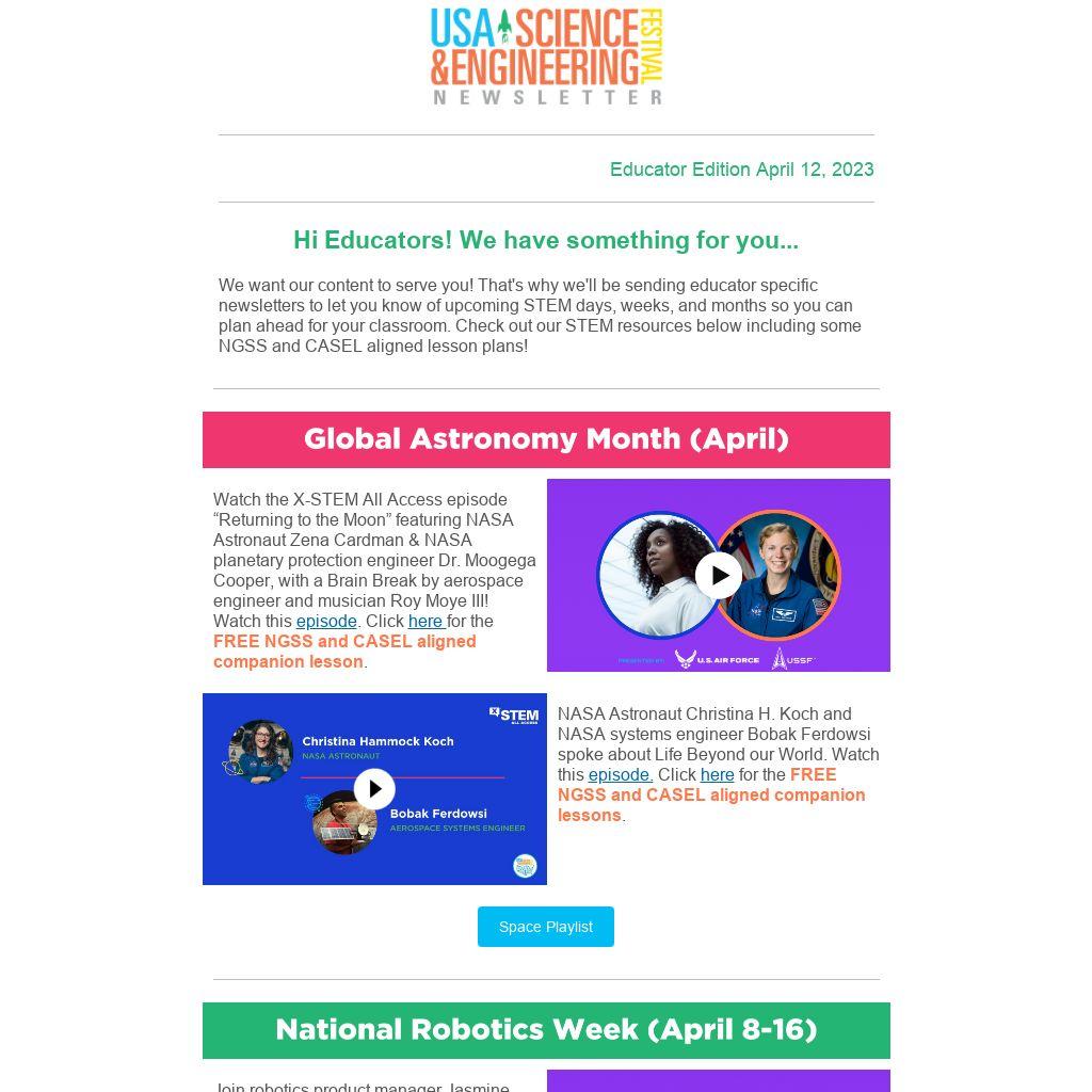 We want our content to serve you! That's why we'll be sending educator specific newsletters to let you know of upcoming STEM days, weeks, and months so you can plan ahead for your classroom. Check out our STEM resources below including some NGSS and CASEL aligned lesson plans!