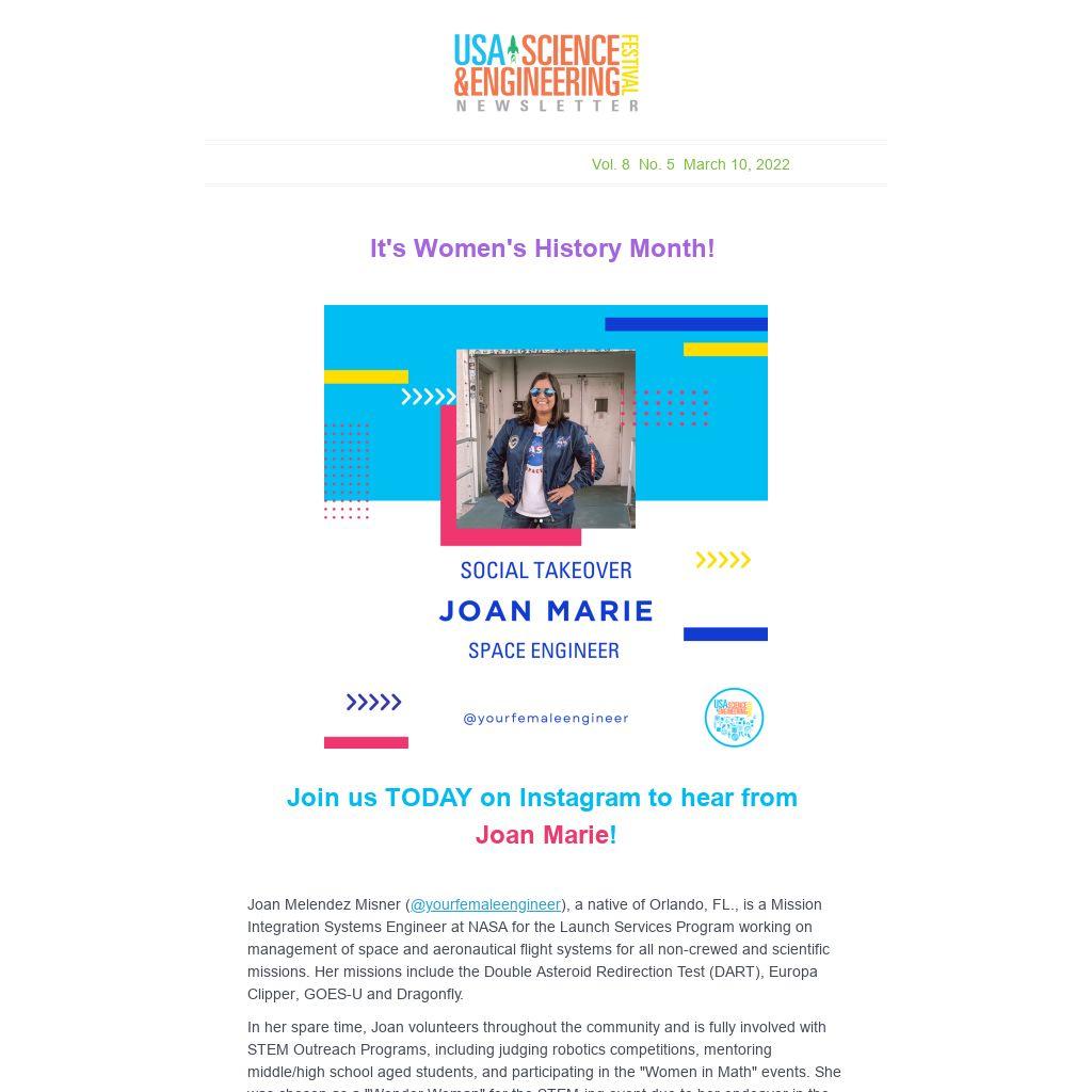 @yourfemaleengineer), a native of Orlando, FL., is a Mission Integration Systems Engineer at NASA for the Launch Services Program working on management of space and aeronautical flight systems for all non-crewed and scientific missions. Her missions include the Double Asteroid Redirection Test (DART), Europa Clipper, GOES-U and Dragonfly.