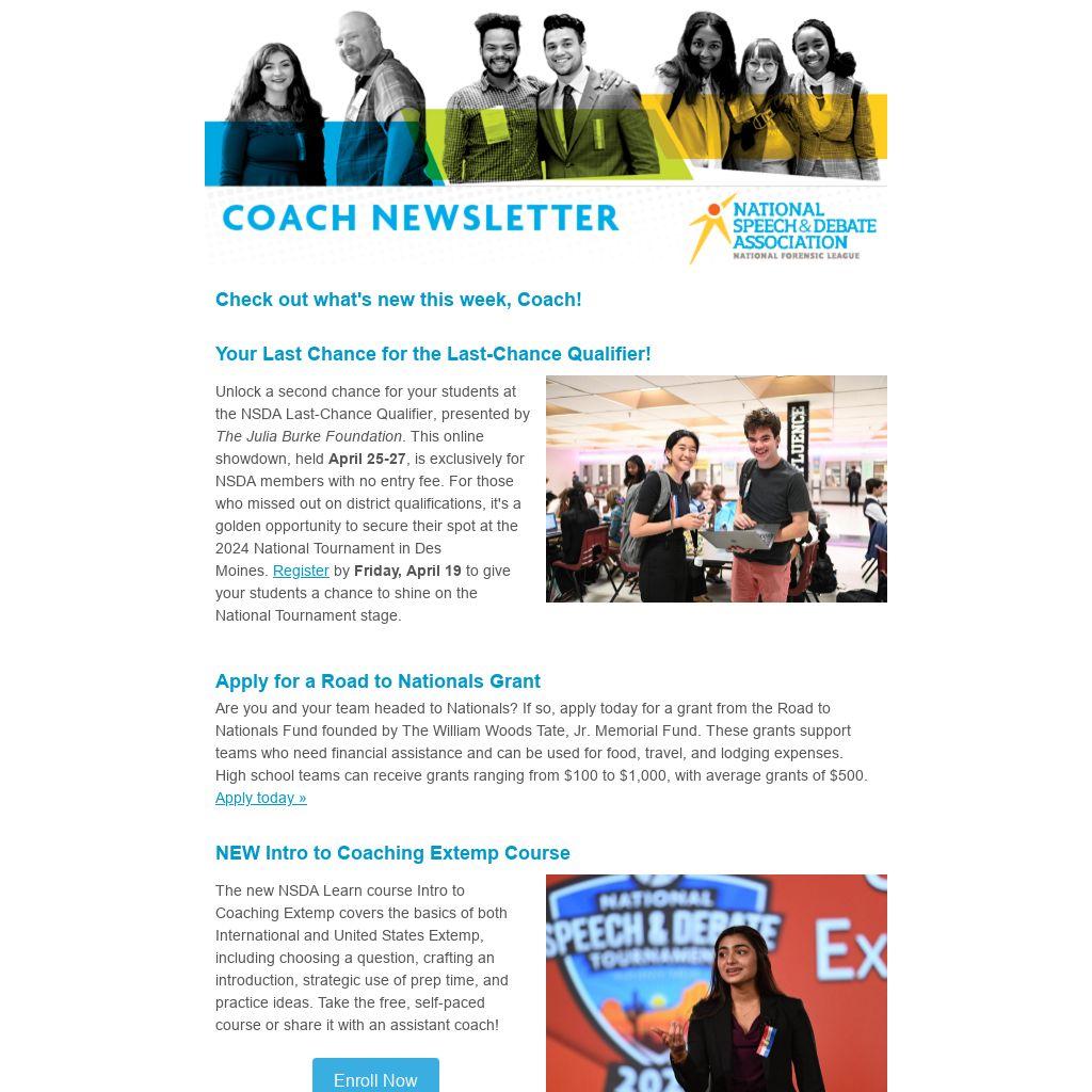 Unlock a second chance for your students at the NSDA Last-Chance Qualifier, presented by The Julia Burke Foundation. This online showdown, held April 25-27, is exclusively for NSDA members with no entry fee. For those who missed out on district qualifications, it's a golden opportunity to secure their spot at the 2024 National Tournament in Des Moines. Register by Friday, April 19 to give your students a chance to shine on the National Tournament stage.