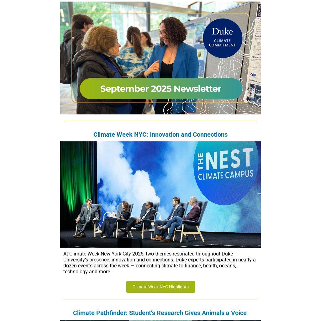 At Climate Week New York City 2025, two themes resonated throughout Duke University’s presence: innovation and connections. Duke experts participated in nearly a dozen events across the week — connecting climate to finance, health, oceans, technology and more.