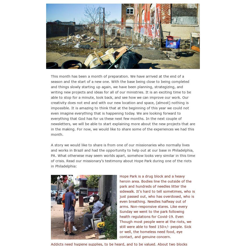 Addicts need hygiene supplies, to be heard, and to be valued. About two blocks down there is smoke, blockades of cops. Police fly around the block ignoring the slouched bodies and needles. Fire trucks circle. Helicopters hover overhead. During the time we were handing out food, they announced a curfew in 2 hours. PA is in a state of emergency with the National Guard on its way into Philly. It feels like home for the first time in a while, before the realization hits, “wait, this is America”. Philadelphia on this day looked like a normal city in Brazil. Two worlds just collided. The chaos and unrest, unemployment, road blockages, tear-gassed protests, fires, violence, and looting, that Philadelphia had experienced over the past few months, is the standard of everyday life in huge portions of the world. The lack of safety, even the “food shortages” during the lockdown, this is normal to millions. Jesus made it clear that He came for all of us. When one of us suffers, we all suffer. Loving people from all walks of life has a cost. It will be uncomfortable, inconvenient, sacrificial. It will cause us to re-think, to change for the better. This is the very nature of family and the nature of Christ.