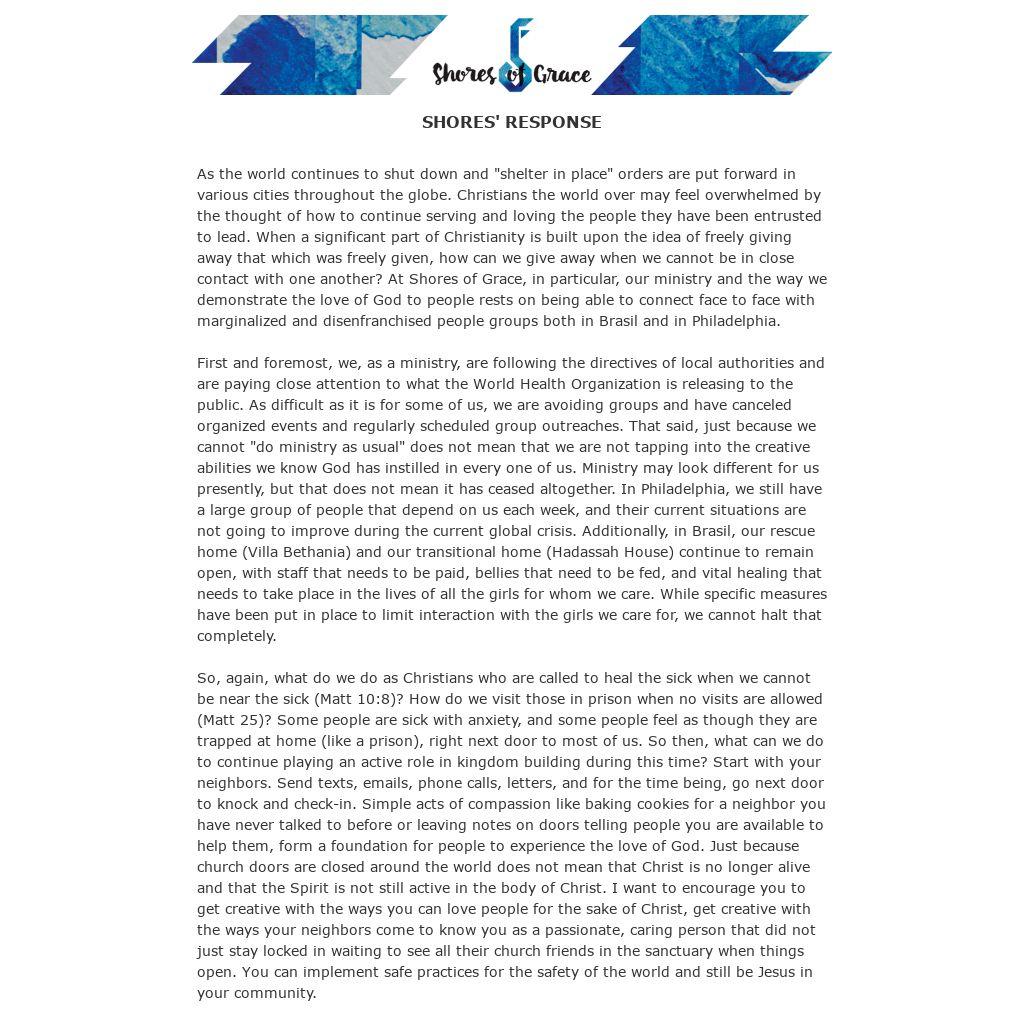As the world continues to shut down and "shelter in place" orders are put forward in various cities throughout the globe. Christians the world over may feel overwhelmed by the thought of how to continue serving and loving the people they have been entrusted to lead. When a significant part of Christianity is built upon the idea of freely giving away that which was freely given, how can we give away when we cannot be in close contact with one another? At Shores of Grace, in particular, our ministry and the way we demonstrate the love of God to people rests on being able to connect face to face with marginalized and disenfranchised people groups both in Brasil and in Philadelphia.