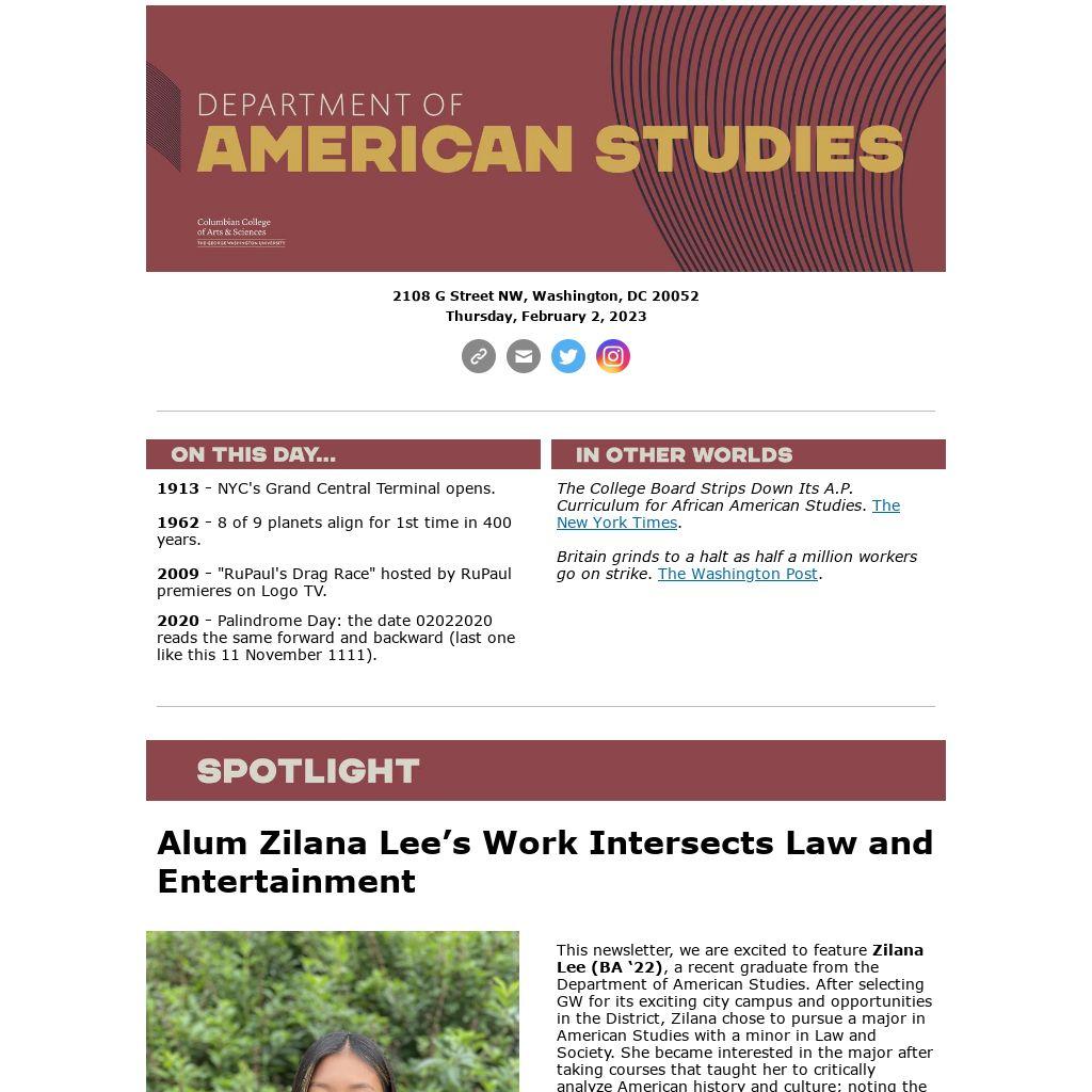 This newsletter, we are excited to feature Zilana Lee (BA ‘22), a recent graduate from the Department of American Studies. After selecting GW for its exciting city campus and opportunities in the District, Zilana chose to pursue a major in American Studies with a minor in Law and Society. She became interested in the major after taking courses that taught her to critically analyze American history and culture; noting the impact of Professor McAlister’s “Critiquing Culture” course and the discussion of affect theory and performance theory. During her time at GW, she interned with Bloomberg News and The Hill, as well as other organizations in the media and journalism world. Following her graduation last year, Lee began her legal career in New York City, where she was accepted into Brooklyn Law School as a recipient of the Richardson Scholarship, and hopes to work in matrimonial and family law.
