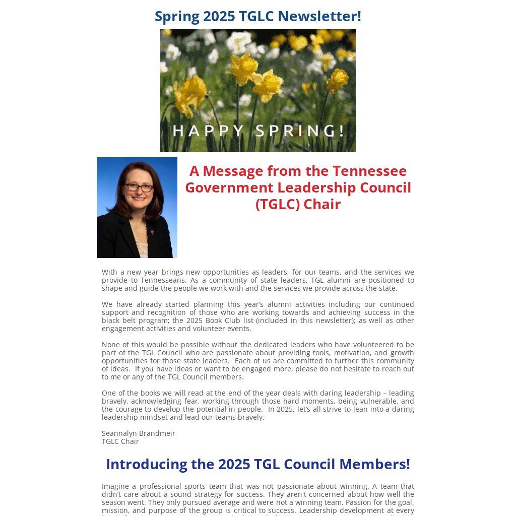 With a new year brings new opportunities as leaders, for our teams, and the services we provide to Tennesseans. As a community of state leaders, TGL alumni are positioned to shape and guide the people we work with and the services we provide across the state.