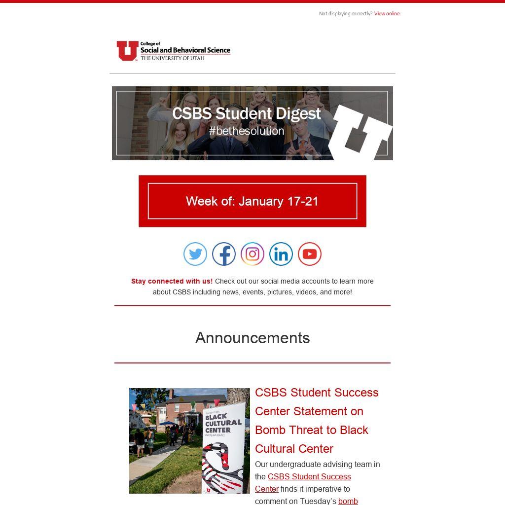 CSBS Student Success Center Statement on Bomb Threat to Black Cultural CenterOur undergraduate advising team in the CSBS Student Success Center finds it imperative to comment on Tuesday’s bomb threat targeting the Black Cultural Center at Ft Douglas. We are dedicated to showing up for and supporting the Black Cultural Center through this time, as they are a vital part in educating, inciting change, and strengthening important bonds within our community.