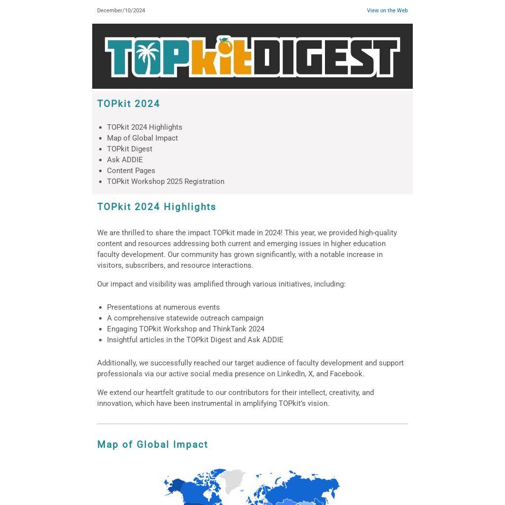 We are thrilled to share the impact TOPkit made in 2024! This year, we provided high-quality content and resources addressing both current and emerging issues in higher education faculty development. Our community has grown significantly, with a notable increase in visitors, subscribers, and resource interactions.