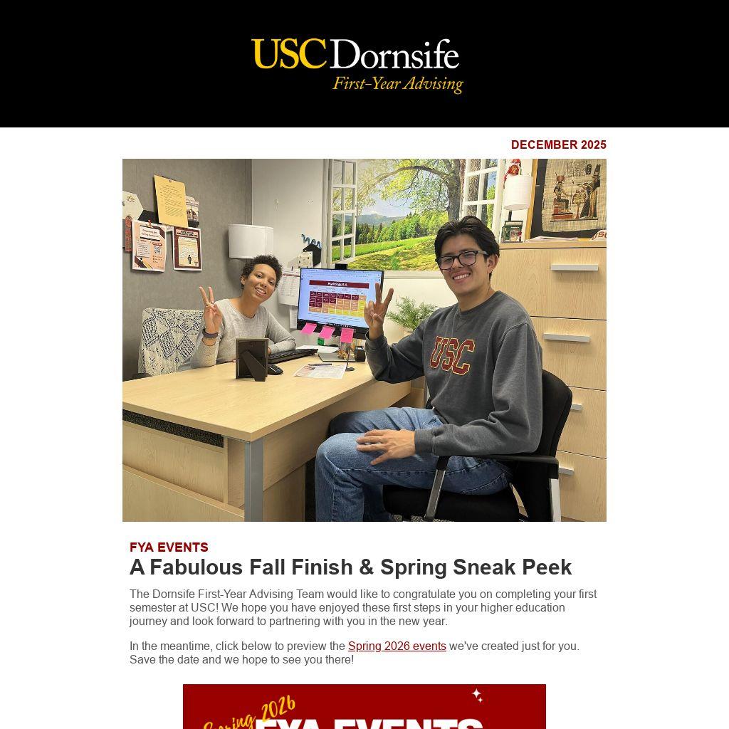The Dornsife First-Year Advising Team would like to congratulate you on completing your first semester at USC! We hope you have enjoyed these first steps in your higher education journey and look forward to partnering with you in the new year.
