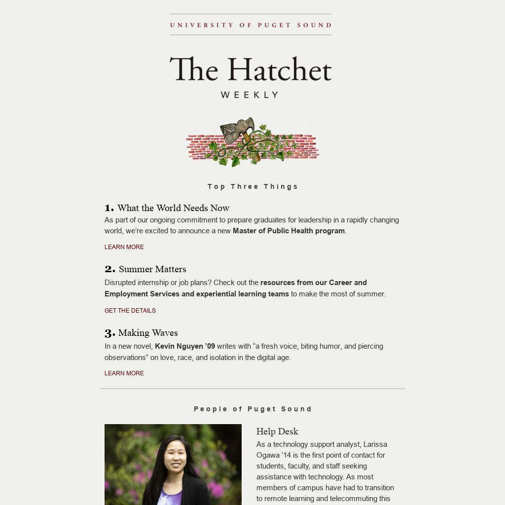 As a technology support analyst, Larissa Ogawa ’14 is the first point of contact for students, faculty, and staff seeking assistance with technology. As most members of campus have had to transition to remote learning and telecommuting this spring, she developed training plans for student staffers that have been adapted to cross-train other Technology Services staff members. She says, “I’m always looking for ways to improve the experience of our customers, as well as our support team.”