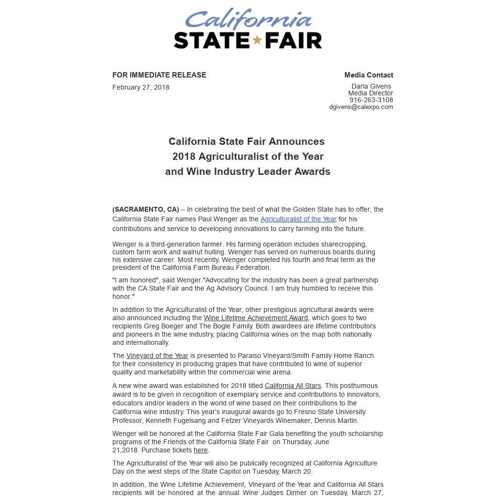 In addition to the Agriculturalist of the Year, other prestigious agricultural awards were also announced including the Wine Lifetime Achievement Award, which goes to two recipients Greg Boeger and The Bogle Family. Both awardees are lifetime contributors and pioneers in the wine industry, placing California wines on the map both nationally and internationally. The Vineyard of the Year is presented to Paraiso Vineyard/Smith Family Home Ranch for their consistency in producing grapes that have contributed to wine of superior quality and marketability within the commercial wine arena. A new wine award was established for 2018 titled California All Stars. This posthumous award is to be given in recognition of exemplary service and contributions to innovators, educators and/or leaders in the world of wine based on their contributions to the California wine industry. This year’s inaugural awards go to Fresno State University Professor, Kenneth Fugelsang and Fetzer Vineyards Winemaker, Dennis Martin. Wenger will be honored at the California State Fair Gala benefiting the youth scholarship programs of the Friends of the California State Fair on Thursday, June 21,2018. Purchase tickets here. The Agriculturalist of the Year will also be publically recognized at California Agriculture Day on the west steps of the State Capitol on Tuesday, March 20.
